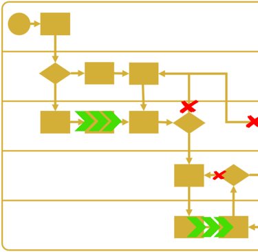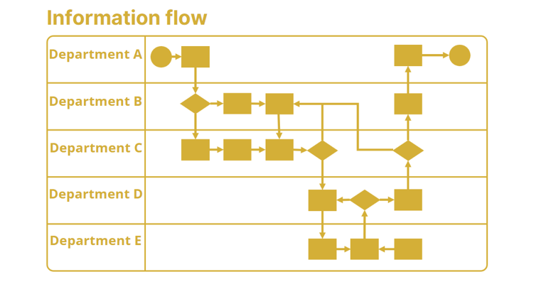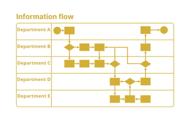 Visualisatie van de processen en flows tussen de afdelingen van uw bedrijf om de informatie-uitwisseling binnen een innovatieproject te optimaliseren en complexiteit te verminderen.